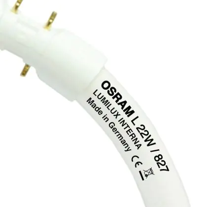 Osram T5 FC 22W/827 Circline Lumilux Interna 2GX13are fluorescent tubes circular shaped and have a 16 mm diameter. These lamps are designed primarily for decorative applications because they can create extra flat luminaires. These lamps should be used with electronic ballasts.With their 2GX13 base, Osram T5 FC 22W/827 Circline Lumilux Interna 2GX13easily integrate into light fixtures.