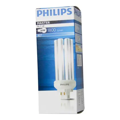 The Philips PL-T 4P lamps are 4 pin sockets lamps and are made of 6 tubes. They are compact fluorescent lamps with separate power supplies. They are very energy efficient and must be used with a ferromagnetic ballast. Philips PL-T 26W 827 4P have a GX24q-3 socket type and measure 590 cm.