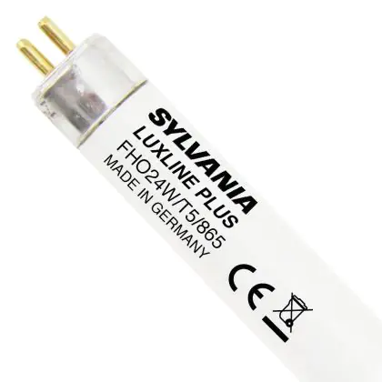The Sylvania T5 FHO Luxline Plus are fluorescent lamps of 16mm of diameter that combine maximum light efficiency and low power consumption. The luminous flux is excellent all along their lifetime. They measure 549mm and has G5 type of socket. The Sylvania T5 FHO 24W/865 G5 Daylight Deluxe will offer a high light quality with his colour rending index greater than 80Ra. The emitted light will be white and very cool: 6500k (daylight). The lamps are classified A for the energy etiquette. Their very long lifetime is about 24000 hours. Therefore, they make important energy savings.